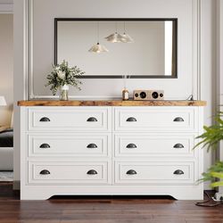 59" 6 Drawers Dresser for Bedroom, Power Strip, Farmhouse Large Wood Dressers & Chest of Drawers with Wide Storage Cabinet, Rustic Brown & White $105Arcadia, CA