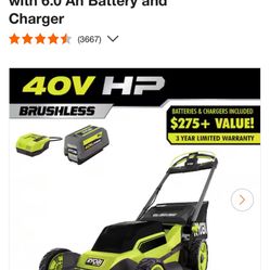 Ryobi 40V HP Brushless 20 in. Cordless Electric Battery Walk Behind Self-Propelled Mower with 6.0 Ah Battery and Charger$190Los Angeles, CA
