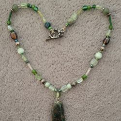 Green beaded necklace with a dark, speckled natural stone pendant and glass beads, 17 inch. $25Los Angeles, CA