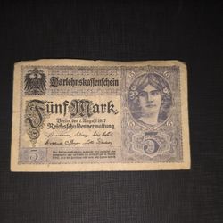 5 Mark DarlehnskassenscheinGerman Empire on August 1, 1917$5San Juan Capistrano, CA