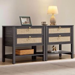 Set of 2, Large Nightstand with Drawers and Storage Shelf - Rattan Boho Bedside Table Narrow Side Ta$125Temecula, CA