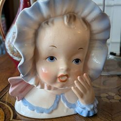Vintage Enesco Baby In Blue & White Bonnet Head Vase With Raised Hand~Japan Mid Century$20Orange, CA