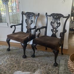Early 20th c hand carved mahogany chippendale Arm chairs with velvet cushions, a pair $1,250West Hollywood, CA