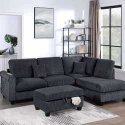 106” Black Corduroy Sectional Sofa with Storage Ottoman and built-in USB port, Sofa, Couch, Plush Black Sofa Couch, Black couch, Plush Black Sectional$529Rowland Heights, CA