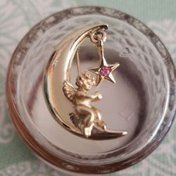 Vintage Signed L Razza Goldtone Cherub Moon With Pink Rhinestone Star Brooch Pin F11$12Diamond Bar, CA