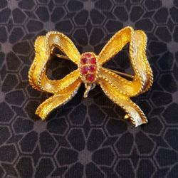 Red Rhinestone Bow Brooch Pin Gold Tone. F10