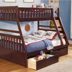 Full over Full bunk bed. Dark walnut,grey & white-$499. Full mattresses -$125.00 each. Assembly not included. Taxes included. Free delivery. Se habla$499Downey, CA
