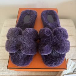 Guaranteed Authentic Hermes Shearling Oran Sandals In Deep Purple Size 38.5$850Los Angeles, CA