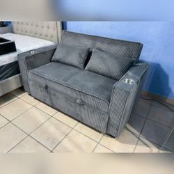 Gray corduroy loveseat pull out sofa bed with cup holder $349Santa Ana, CA