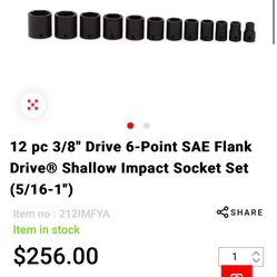 12 pc 3/8" Drive 6-Point SAE Flank Drive® Shallow Impact Socket Set$200Artesia, CA