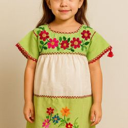 Girls Mexican Embroidered Dress Green White Cotton Handmade Huasteco Folk Size 4$38Huntington Park, CA