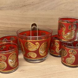 Vintage Mid-Century Modern Culver Red and 22k Gold Paisley Ice Bucket and 5 Lowball glasses.$125Hayward, CA