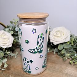 Holographic Cowboy Boot Glass Cup | Western Sparkle Cup | Cute 16 oz Glass Can$18Stockton, CA