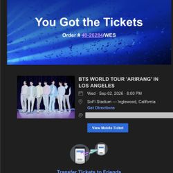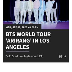 2x BTS ARIRANG Sofi Sept 1 Lower Bowl$1,050Chino Hills, CA