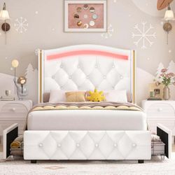 Upholstered Twin LED Bed Frame with Crystal Button-Tufted Headboard & 4 Storage Drawer, Modern PU Princess Twin Size Platform Bed Frames for Kids/Girl$169Downey, CA