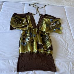Silk-Feel Boho Halter Blouse – Olive Floral Empire Waist Statement Top (S)$45Los Angeles, CA