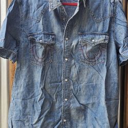 True Religion Men's Blue Denim Horseshoe Embroidered Western Snap Shirt - 3XL