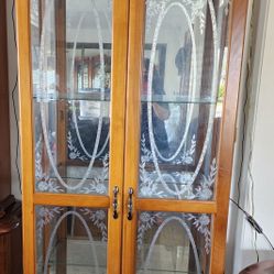 light wood curio cabinet featuring two doors with etched floral glass patterns and a mirrored back for displaying collectible$150Garden Grove, CA