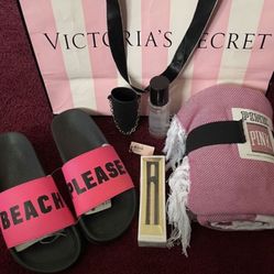 Victoria Secret Bundle NWT Victoria Secret beach blanket PINK Victoria's Secret Cheeky Slide "BEACH PLEASE" Size Large 9/10 Victoria secret hand sanit$85Montebello, CA