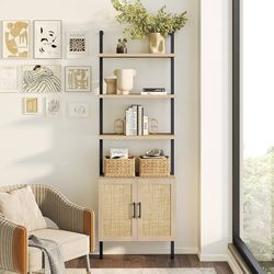 1059 Ladder Bookshelf, 5 Tier 73" Tall Rattan Book Shelf, Farmhouse Boho Bookcase with Doors Adjustable Shelf for Library Living Room Bedroom Home Off$120Bloomington, CA