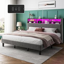 King Size Bed Frame, Vertical Channel Tufted Headboard with Storage Shelves, Velvet Bed Frame with Charging Station & LED Lights, Solid Wooden Slats S$180Fontana, CA