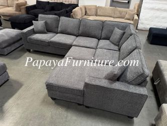 NEW Dark Grey Chenille Fabric Modern U Shape Sectional Sofa Ashley Style Reversible Chaise Ottoman Set Combine into Bed BIG SALE Large Couch Black$799Chino, CA