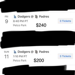 Sep 29th Member Tickets. Padres Vs Dodgers. Section 121, Row 36, Seats 11,12$360San Diego, CA