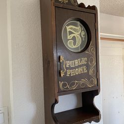 Antique Collectible Retro Wall Decor Public Phone Shelf With Storage, Stained Wood, Custom Art, Gold Door Knob, Glass Door Feat. 5cents! MUST SEE$40Santee, CA