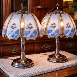 Pair Vintage Dolphin Ocean Scene Touch Lamps Glass Panel Shades Nautical Decor$120Citrus Heights, CA