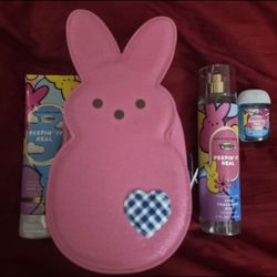 Bath and body works pink marshmallow bunny mini backpack, peepin it real fragrance mist, body cream,$60Bell Gardens, CA
