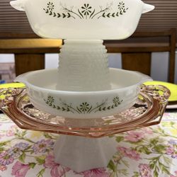 Two Vintage Glasbake White Milk Glass “Green Daisy” $25Downey, CA