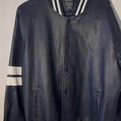 Black Faux Leather Varsity Jacket Mens L Snap Button Stripe Sleeve Bomber Casual$89Santa Ana, CA