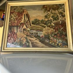 Framed W/ Glass Needlepoint "English Garden" Country Cottage Scene 17 x 20.5”$40Fresno, CA