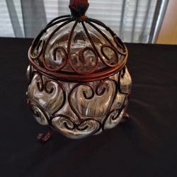 Nice Hand Blown Glass Bowl With Lid In Footed Metal Cage, Located In Reedley $25Reedley, CA
