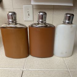 Vintage 2 Leather Glass Flasks 1 Plastic With Metal Shot Lids From The 50- 60 ‘s Has Scotch And Rye Embossed In The Leather$45Fresno, CA