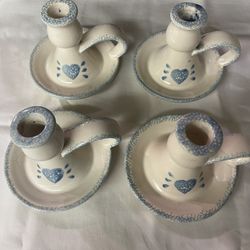 Vintage Spongeware Pottery White w/ Blue Hearts Candlestick Holder- Set of 4$20Berenda, CA
