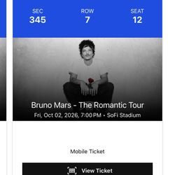 Bruno Mars Tickets$475Fresno, CA