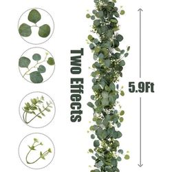 2 pcs / 5.9FT Fake Eucalyptus Garland With White Flowers – Wedding Arch Backdrop Decor, Silver Dollar Leaf Vine For Party, Table, Mantle, Festival$15Jurupa Valley, CA