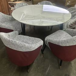 New assembled set of 7, 51.2-inch extendable White sintered Stone Round Dining Table, 6 Dining Chairs Linen and Leather Upholstered Chair with Arched $600Norwalk, CA