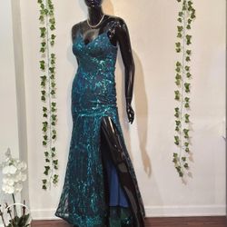 Teal Sequin With A Thigh High Slit Formal Dress & Prom Dress