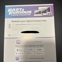 Fast & Furious 8-Movie Collection 4K HDR Digital code$20Anaheim, CA