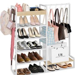 2-in-1 Shoe Rack for Closet with Purse Hanger, Metal Shoe Shelf with Wooden Tray, Backpack Hook, Boot Storage and Removable Shelves, Storage Organizer$50Gardena, CA