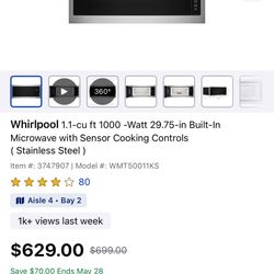Whirlpool 1.1-cu ft 1000 -Watt 29.75-in Built-In Microwave with Sensor Cooking Controls ( Stainless Steel)$480Santa Ana, CA
