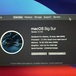 MacBook Pro (Retina, 15-inch, 2.5GHz 16G Mid 2014)$200Rossmoor, CA