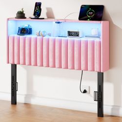 Greenstell Twin Size Adjustable Storage Headboard Only - Modern Upholstered Head Board with LED Lights, Charging Station & Soft Padding, Pink