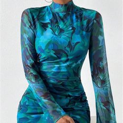 Women's short dress with a mock turtleneck, tropical floral print, long sleeves, mesh, fitted, ruched, short$25Whittier, CA