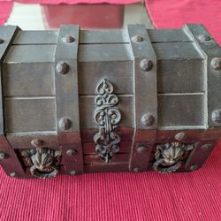 Cool wooden treasure chest. Dark wood, decorative accents and studs. Ornate clasp and lion head pulls on front. Inside lined with soft yellow fabric$20Tustin, CA