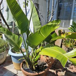 Two Bird Of Paradise Tree with new pups bears white and blue birdlike flowers in a partially broken pot thats not$55Irwindale, CA