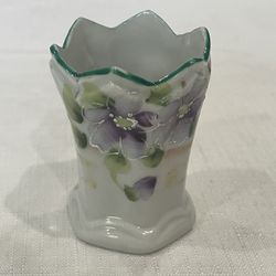 Hand-painted Japanese porcelain decorative Small Vase Like item, 2 1/2 inches tall, with purple flowers and scalloped rim.$20Anaheim, CA