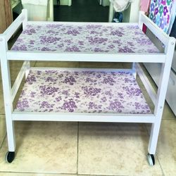 Farmhouse wheeled wood cart. White w/purple flowers + leaves print w/2 shelves$55Costa Mesa, CA